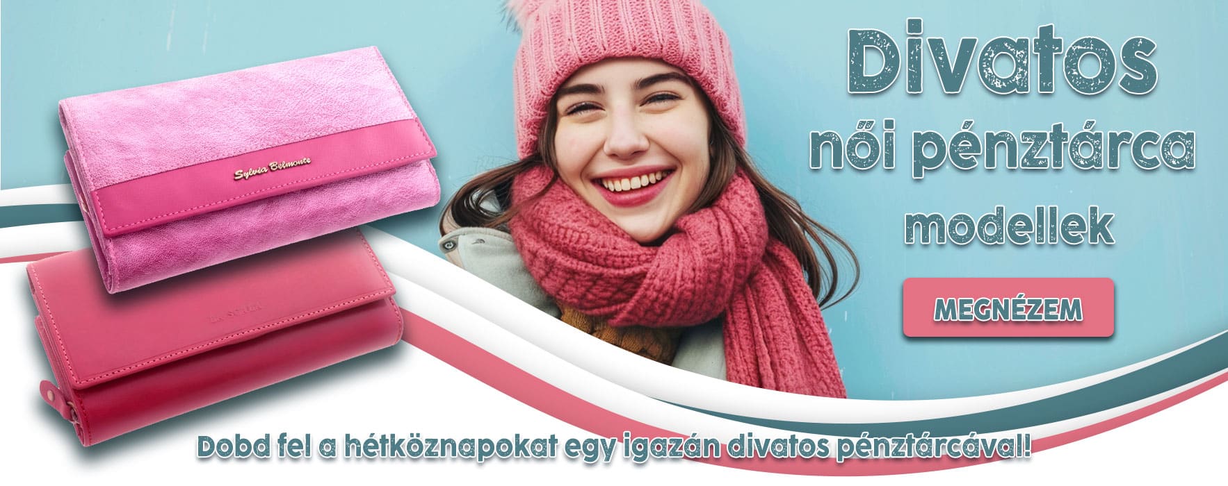 - Divatos modelljeinket megtalálhatja a női divatos pénztárca kategóriánkban. Ezek a termékek amellett, hogy belül rendkívül praktikus elrendezésűek, a legutolsó divat szerinti külső felületi dizájnnal rendelkeznek. Anyaguk egyaránt a legkiválóbb kikészítésű marhabőr. A bőr fajtáját tekintve pedig gyík és croco mintázatú lakkbőr, felület festett nappa bőr, egyedi külső felületi présmintával ellátott marha bőr, geometriai mintás tricolor marha bőr, virágmintás felületi benyomattal ellátott bőr, levélmintás felületi benyomattal ellátott bőr, csíkos- pöttyös külső felületű nappa bőr, valamint eredeti Swarovski köves lakkbőr.