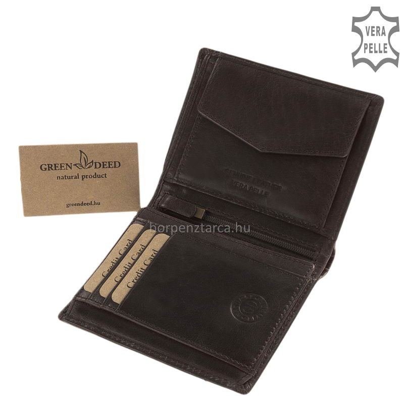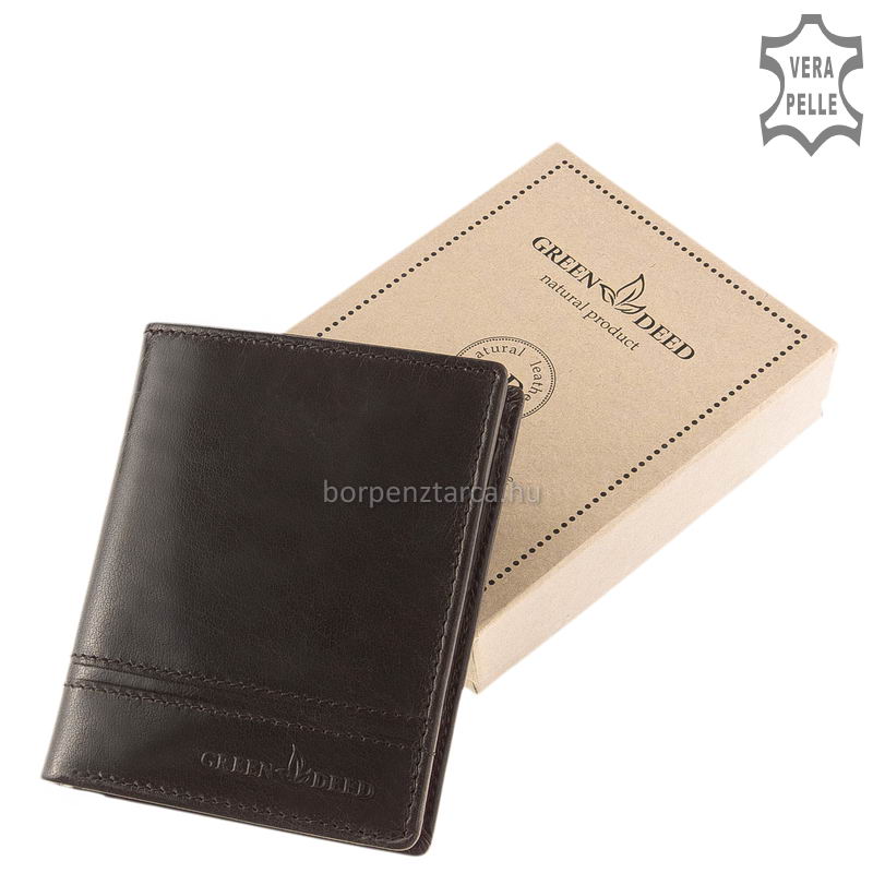 Praktikus méretű, irattartóként is remekül használható minőségi valódi bőr férfi pénztárca, melynek fedelén elegáns és divatos GreenDeed márkajelzés került benyomásra.