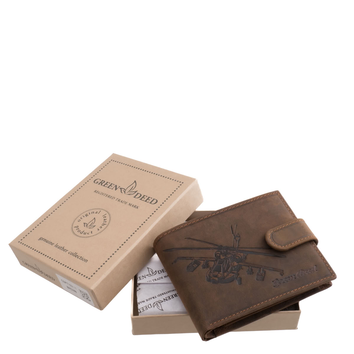 Ez a GreenDeed márkájú, valódi bőrből készült férfi pénztárca különleges modell, amelynek fedelét egy részletgazdagon kidolgozott harci helikopter mintával díszítettük.