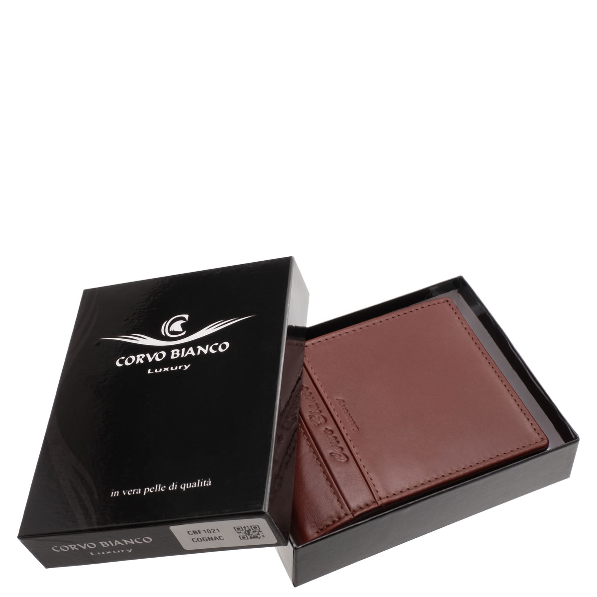 A pénztárca fedelén függőleges csíkbetét fut végig, melyben míves CORVO BIANCO márkafelirat és a mellette elhelyezett Luxury jelzés látható.