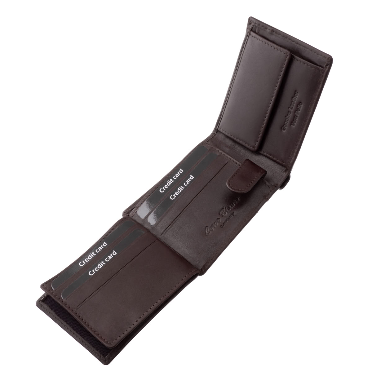 A pénztárca fedelén függőleges csíkbetét látható, benne a CORVO BIANCO márkafelirat és a mellette elhelyezett Luxury jelzés.