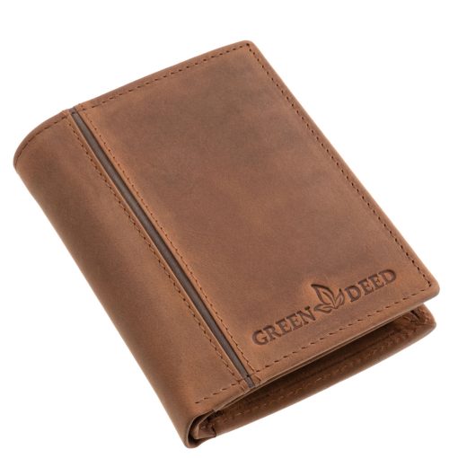Közepes méretű, sportos dizájnnal rendelkező valódi bőr férfi irattartó pénztárca modell a GreenDeed-től, minőségi, természetes hatású díszdobozban.