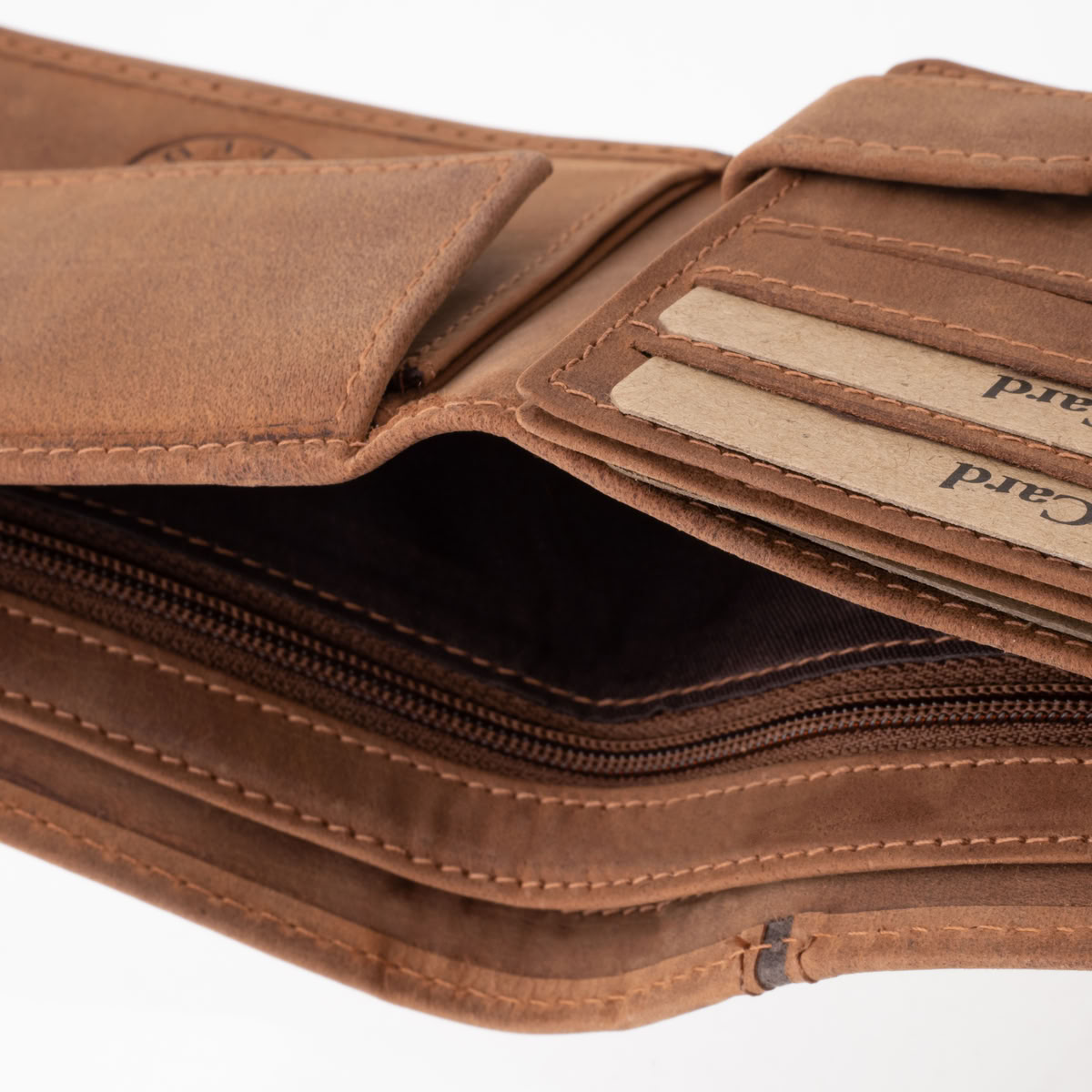A pénztárca natúr hatású, matt felületű bőrből készült, így megőrzi a valódi bőr természetes textúráját és tapintását.