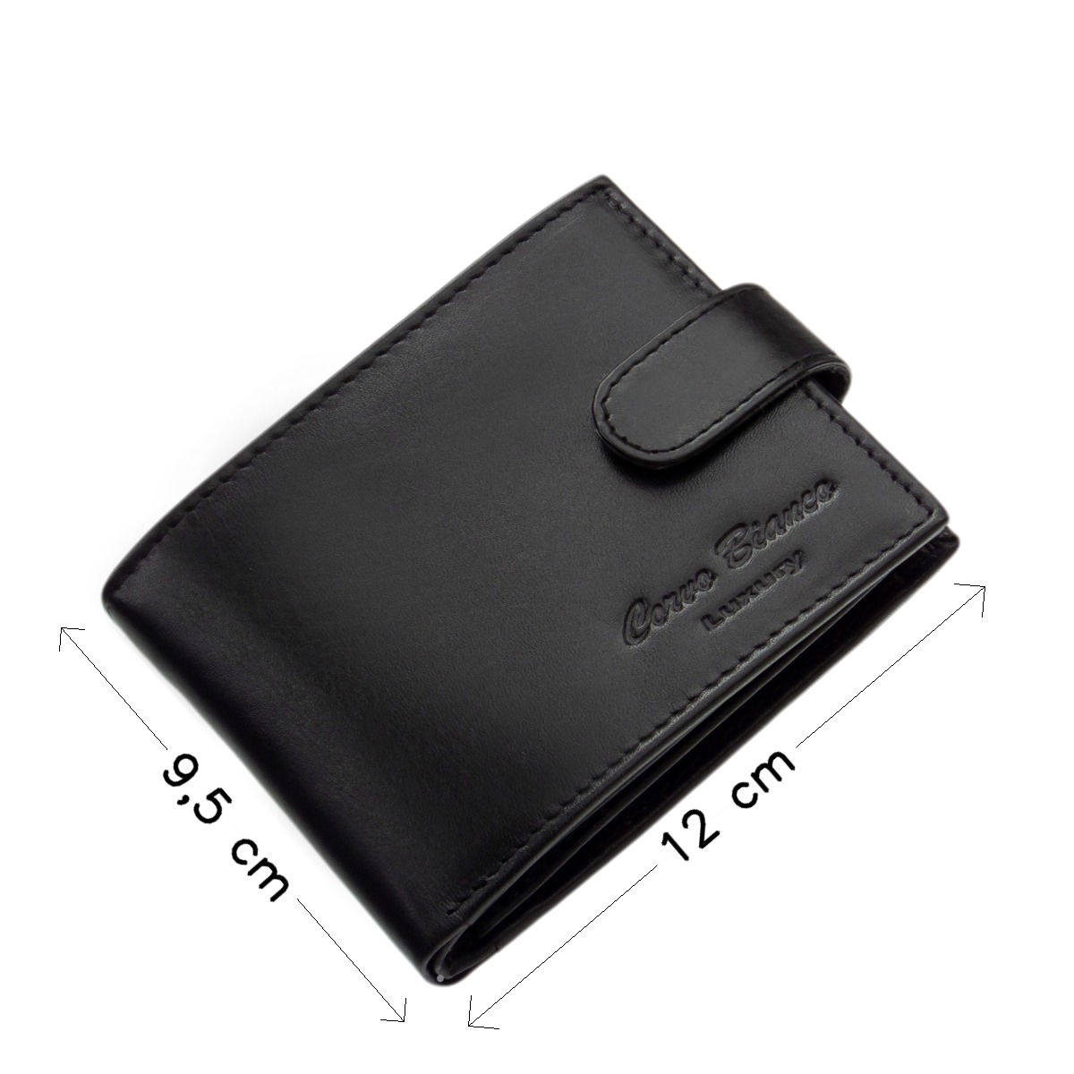 A pénztárca szolid fényű, elegáns fekete bőr felülettel rendelkezik, melyen a Corvo Bianco Luxury felirat olvasható.