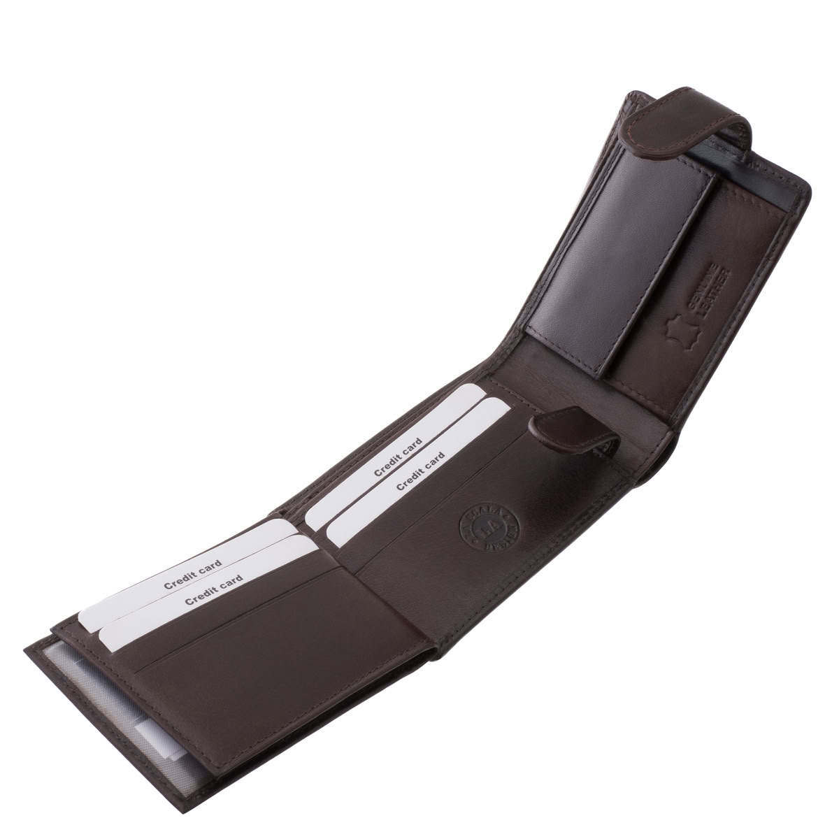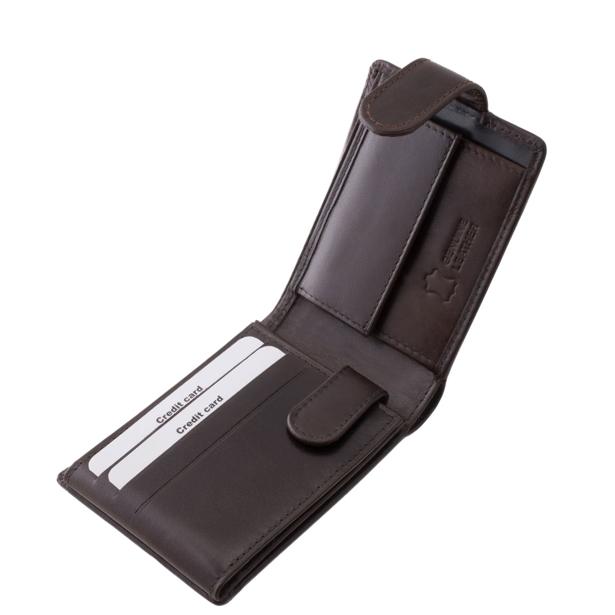 Elegáns, kisméretű valódi bőr férfi pénztárca patentos átkapcsoló pánttal, díszdobozban