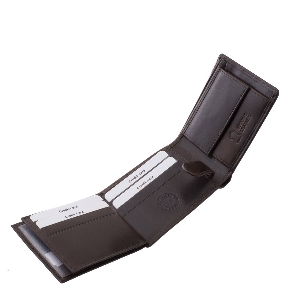 Ez a prémium minőségű, valódi bőr férfi pénztárca kompakt kisméretű modell, elegáns, fényes bőrfelülettel, igényes díszdobozos kivitelben.