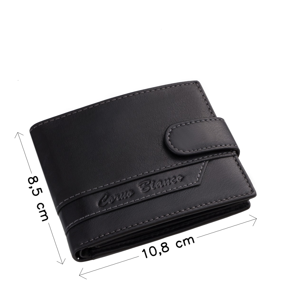 A pénztárca fedelét egy modern és elegáns megjelenést kölcsönző bőrbetét díszíti, rajta minőségi díszvarrással és a Corvo Bianco felirattal.