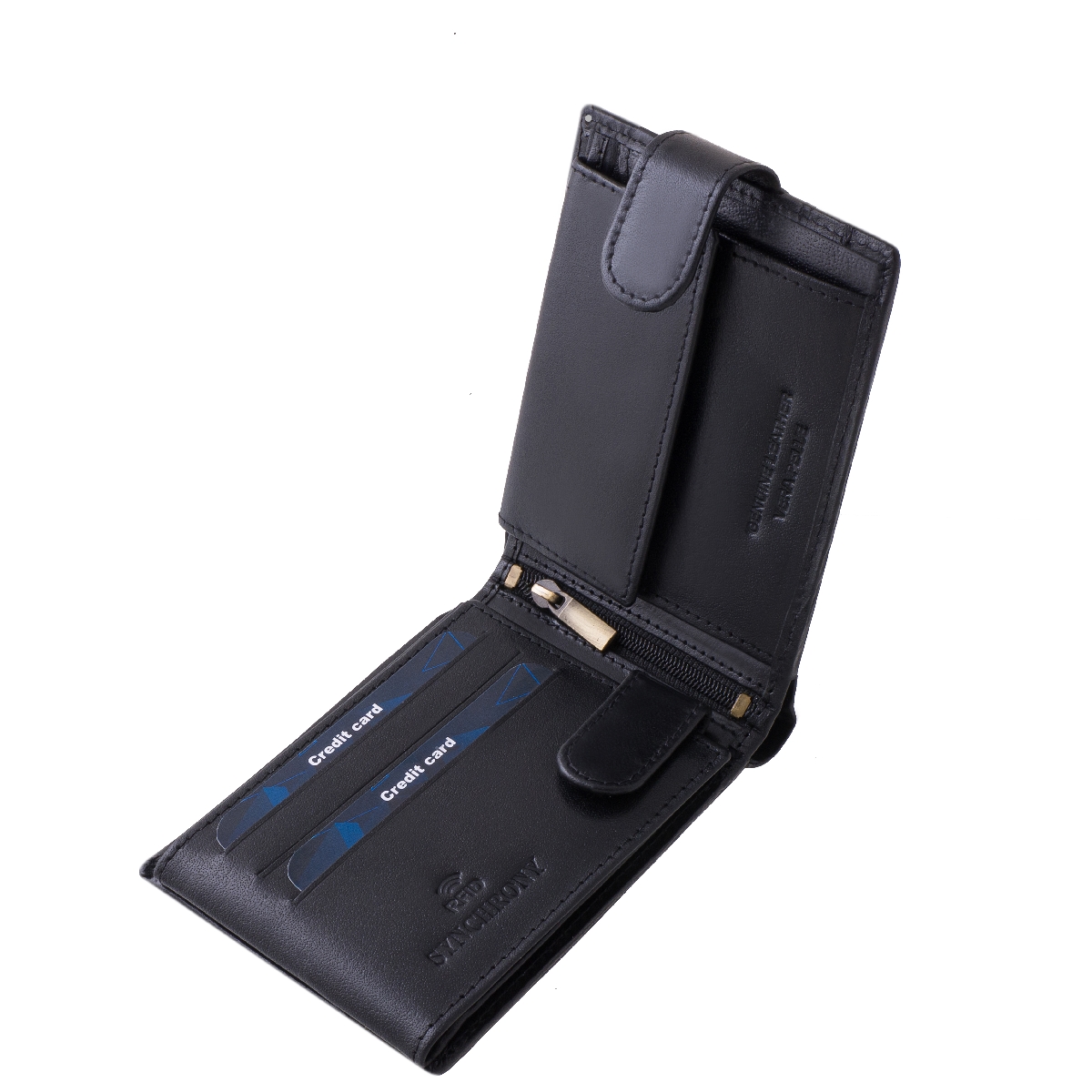 Fedelén a SYNCHRONY márkajelzés szép benyomása látható. Aprópénztartója alatt GENUINE LEATHER VERA PELLE feliratra lehetünk figyelmesek.
