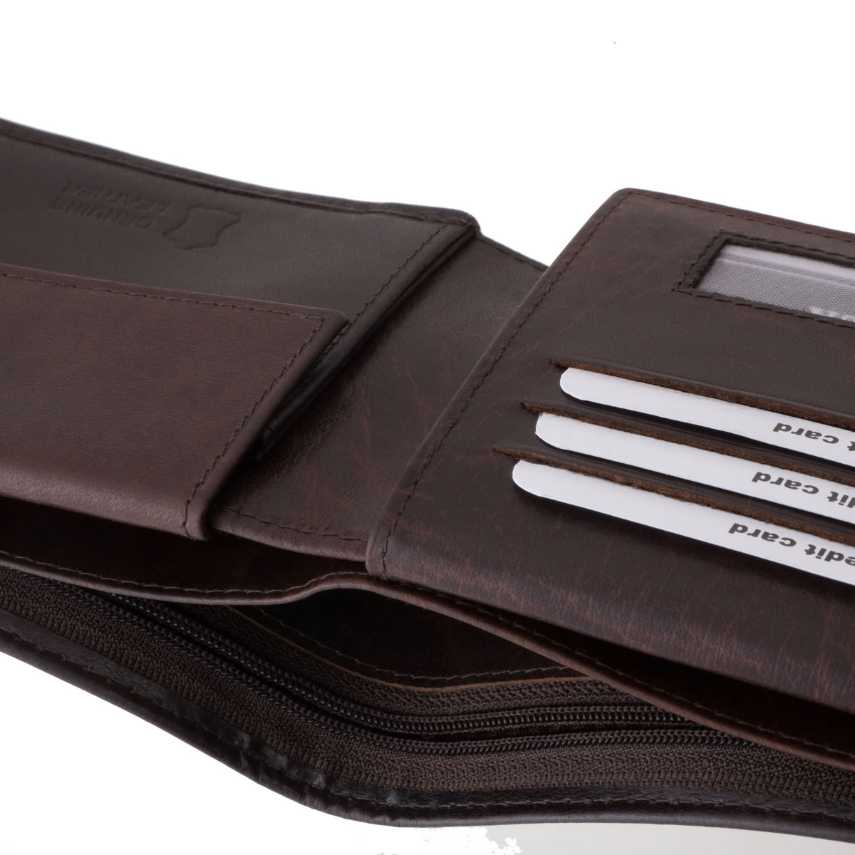 A fedelét patentos átkapcsoló pánt fogja össze, amely fokozott biztonságot nyújt, és kiemeli a pénztárca elegáns funkcionalitását.