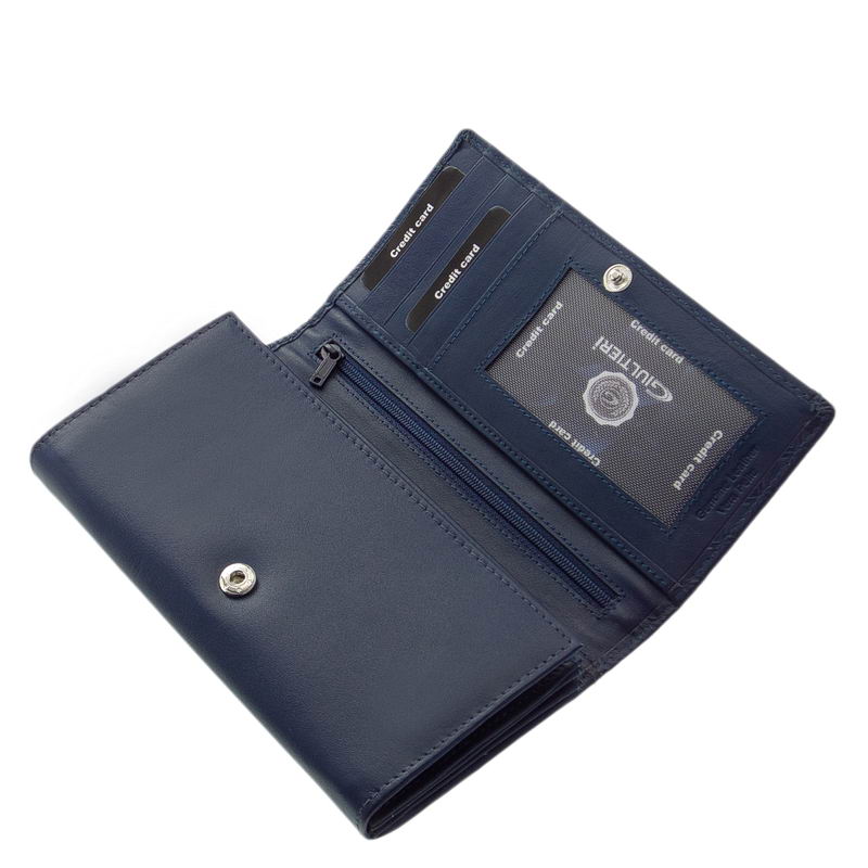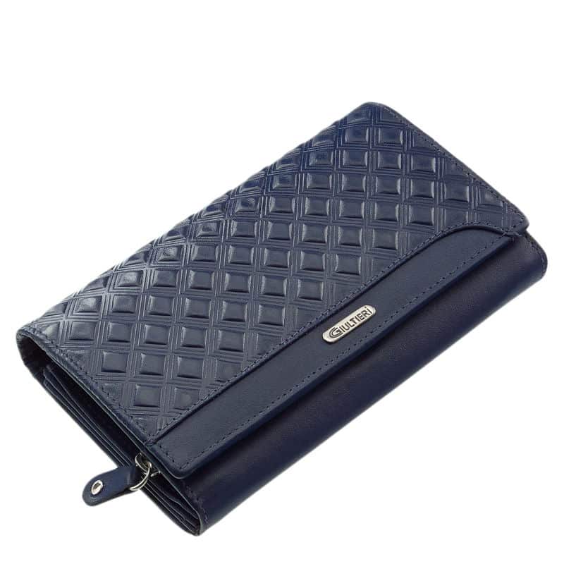 Tárcánk elején dekoratív Giultieri fémlogó látható. A pénztárcák legfontosabb esztétikai, dizájn eleme a modellek külső felülete, fedele.