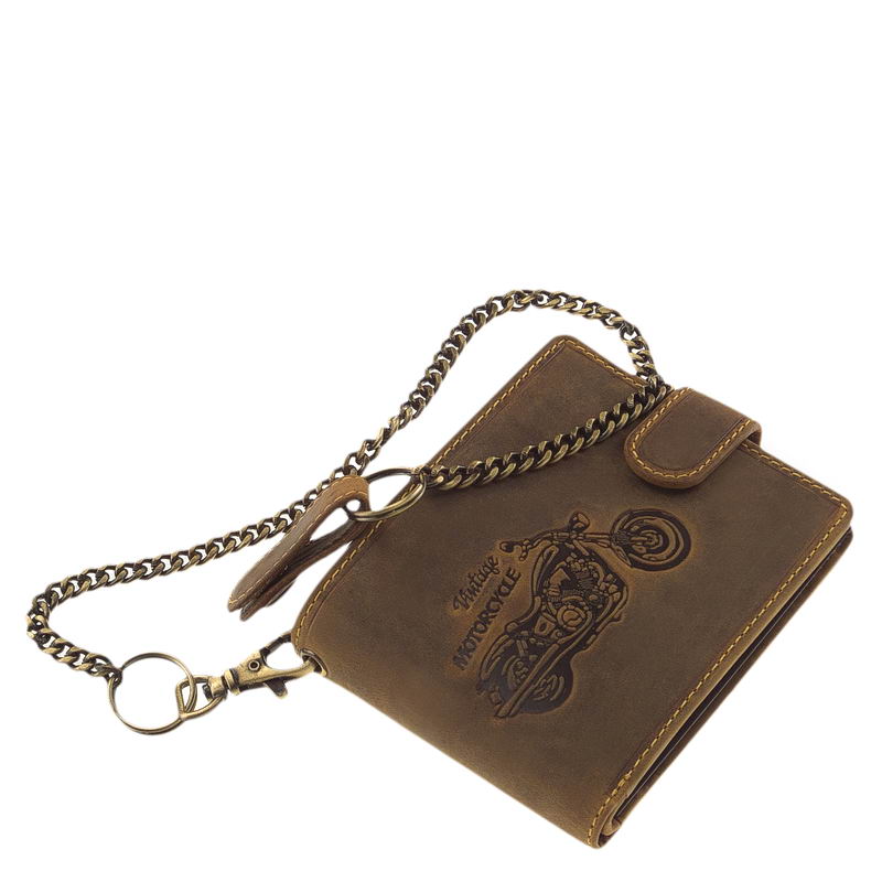 Praktikus kialakítású, valódi bőr férfi pénztárca motor mintás, barna színű külsővel, díszdobozos kivitelben.