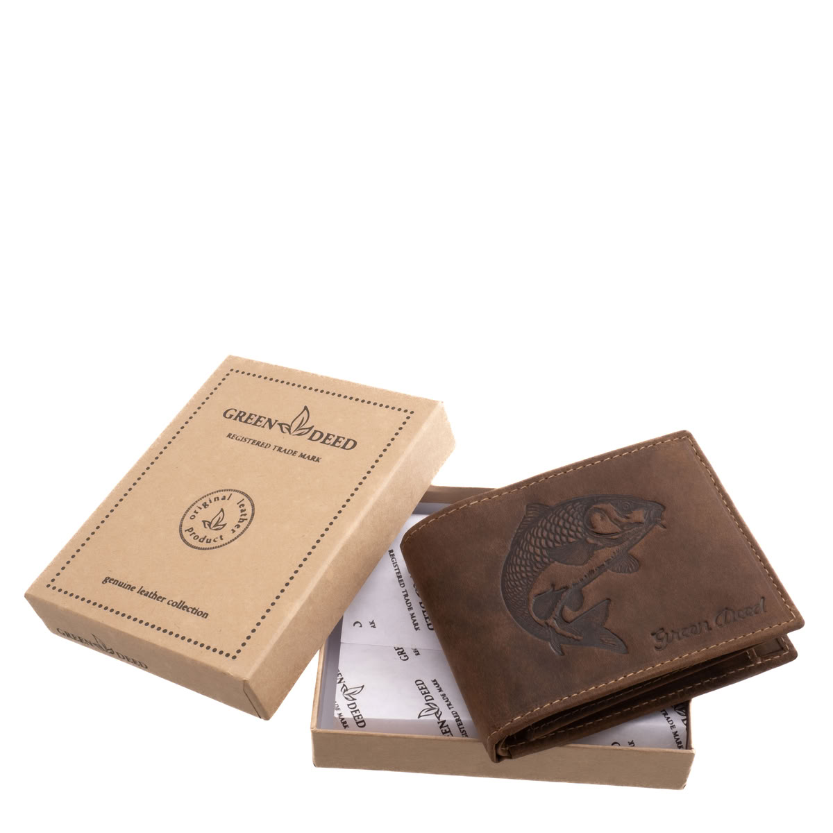 Valódi bőr alapanyagból készült, horgász, férfi pénztárca, amelynek fedelét egy különleges technológiával készült, kiemelkedő ponty mintázat díszíti.