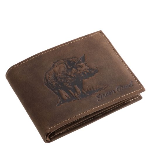 Valódi bőr férfi pénztárca, amelynek fedelét részletgazdag, vaddisznót ábrázoló minta díszíti, kis méretű és praktikus kialakítású modell.