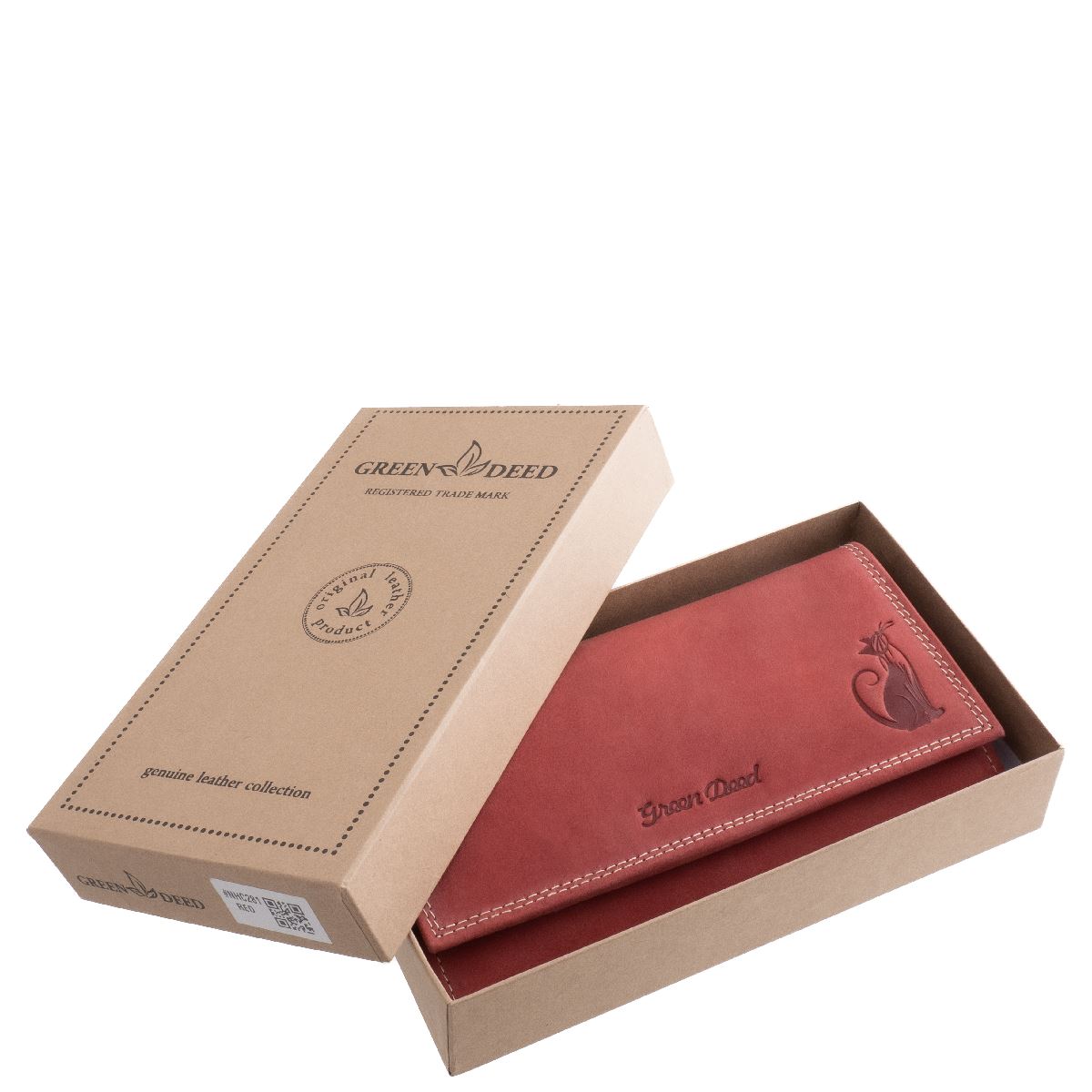 Divatos piros színű, puha tapintású valódi bőr női pénztárca fedelén macskás díszítéssel, stílusos díszdobozban kapható nagy méretű GreenDeed modell.