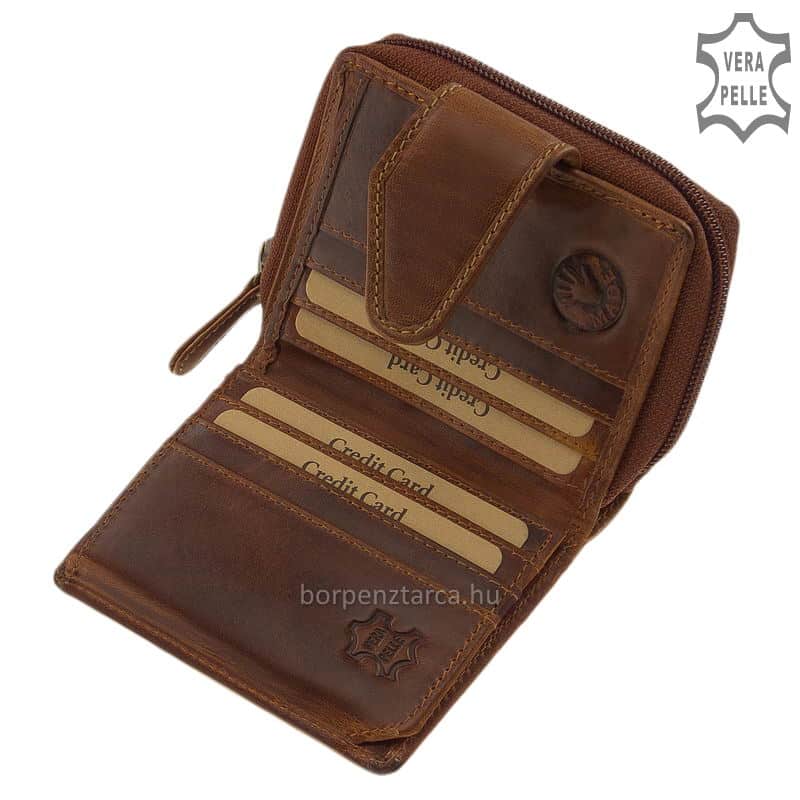 Kissé koptatott jellegű, barna színű valódi bőrből készült minőségi női bőr pénztárca.