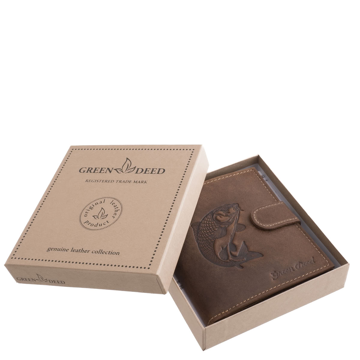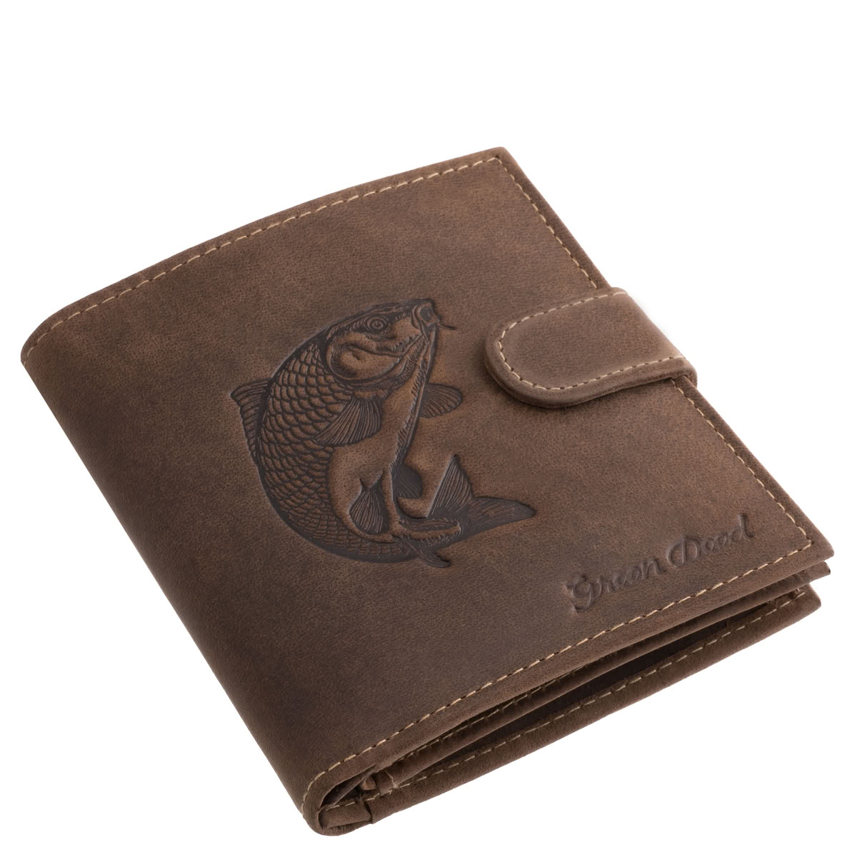 Valódi bőrből készült, nagy méretű férfi irattartó pénztárca, amelynek fedelét a természetet idéző, kiemelkedő ponty mintával díszítettük.