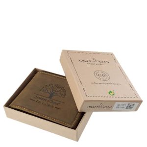 A férfi pénztárca natúr hangulatával harmonizáló kezeletlen papírból készült dobozcsomagolást kapott ez az egyedi termékünk.