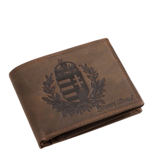 Valódi bőr férfi pénztárca magyar címer mintával, melyet részletgazdag koszorú motívum ölel körbe, a GreenDeed márkacsalád díszdobozos terméke.