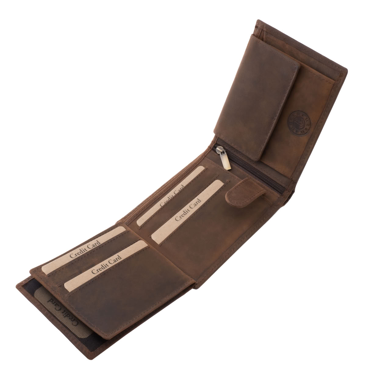 A pénztárca fedelén részletgazdag, minőségi benyomás található, amely egyedi megjelenést kölcsönöz a modellnek.