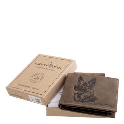 Natúr hatású valódi bőr felülettel rendelkező, egyedi németjuhász kutyás pénztárca, minőségi díszdobozos csomagolásban a GreenDeed márkacsalád terméke.