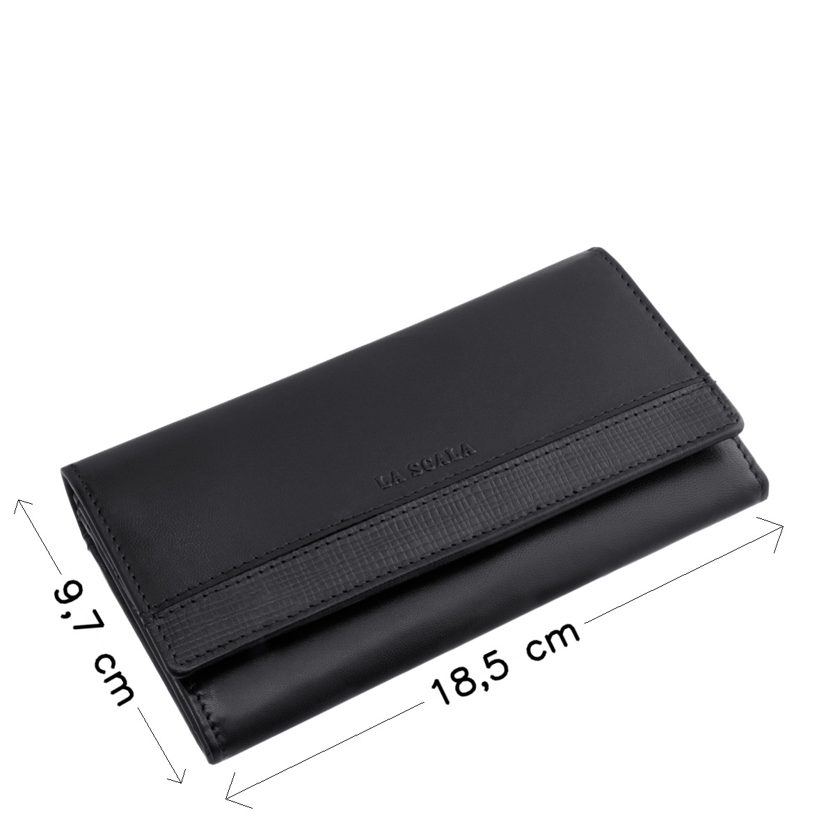 A hosszúkás forma, a kellemes tapintású valódi bőr borítás és a dombornyomott La Scala márkajelzés igazán kifinomult, exkluzív megjelenést biztosít ennek a pénztárcának.