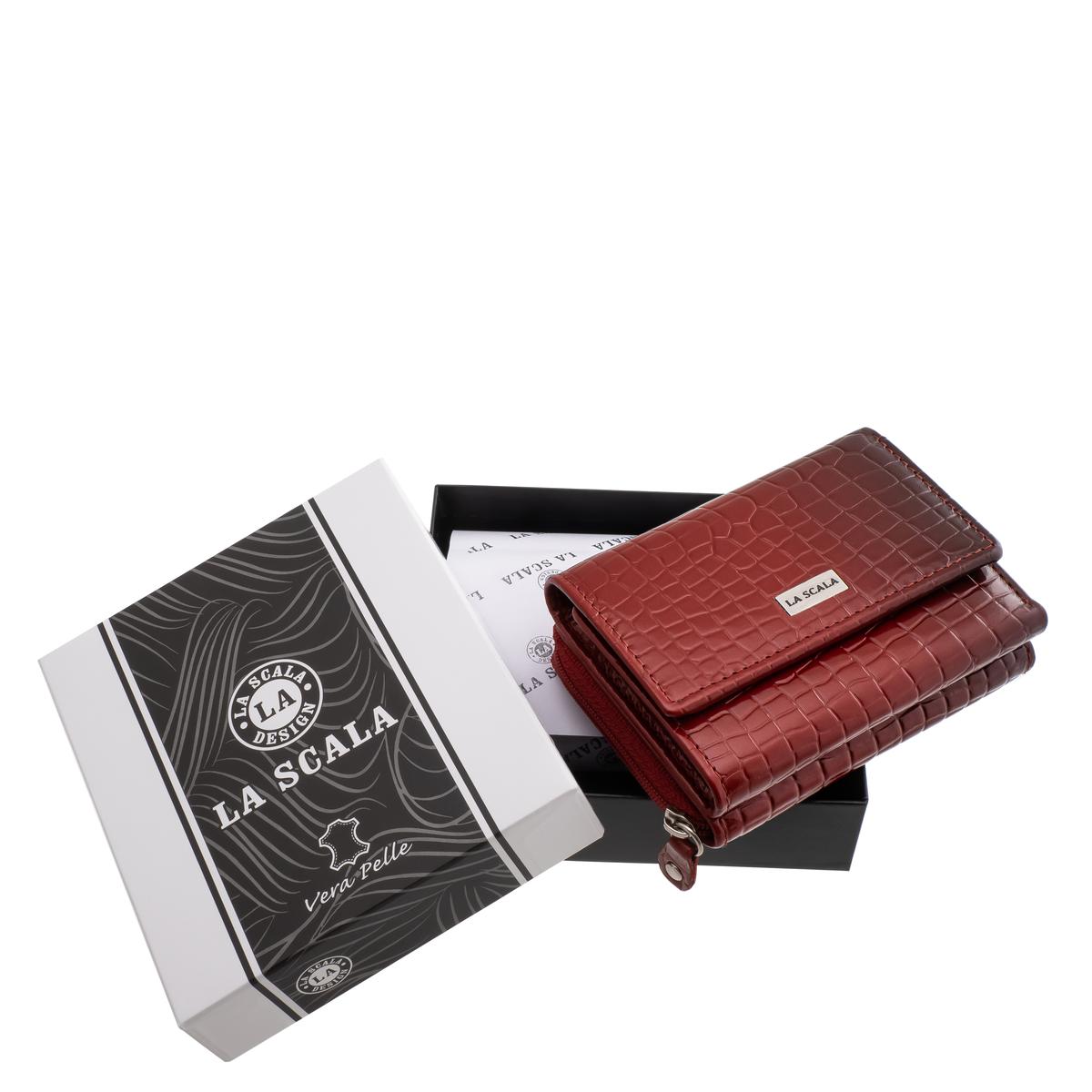 Kiváló minőségű, divatos, valódi bőr, croco mintás, fényes, kis méretű női pénztárca modell, fedél részén La Scala fémlogóval díszítve, díszdobozban szállítva.