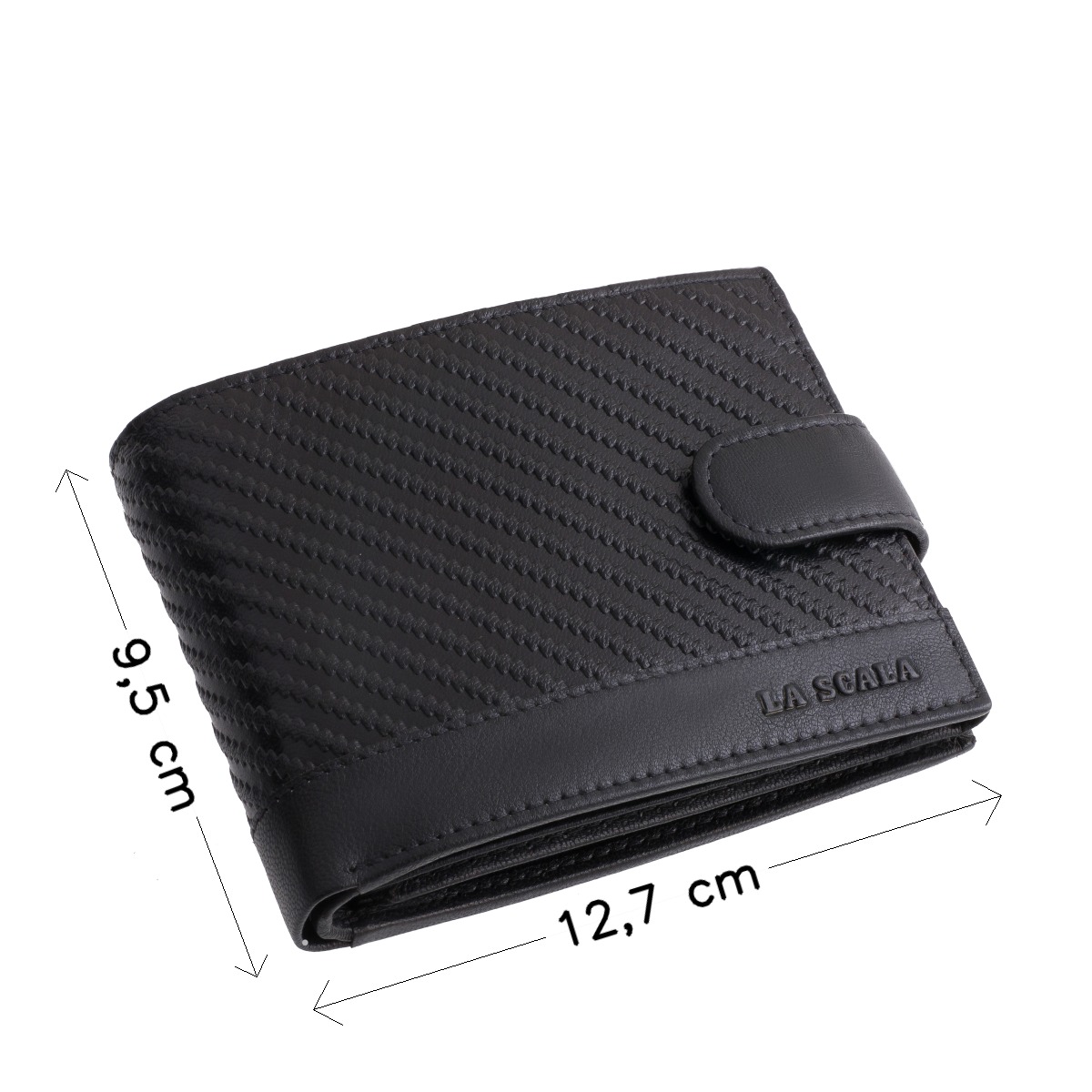 Egyedi felületi dizájnnal rendelkező valódi bőr férfi pénztárca a hozzáillő, stílusos és minőségi La Scala feliratos díszdobozban.