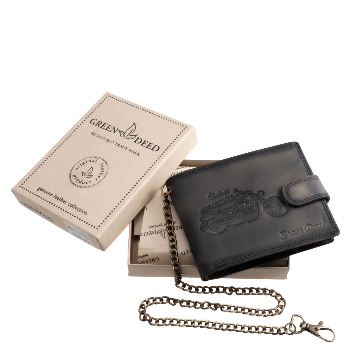 A motoros mintával díszített, antikolt hatású valódi bőr pénztárca natúr megjelenésű, GreenDeed logós díszdobozban érkezik.