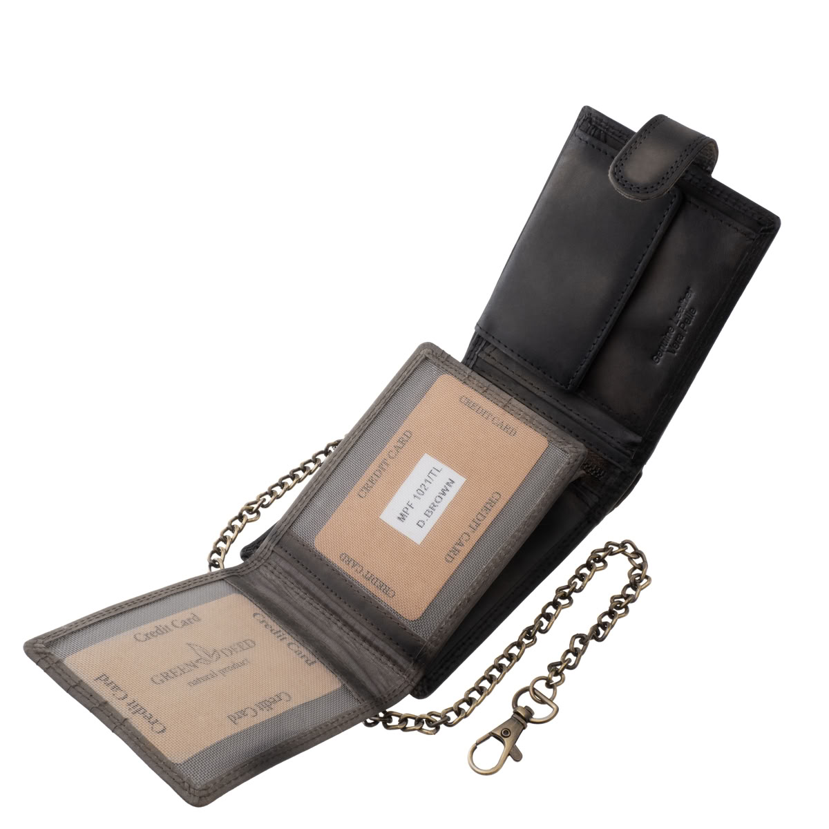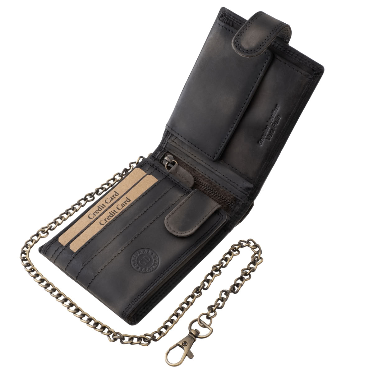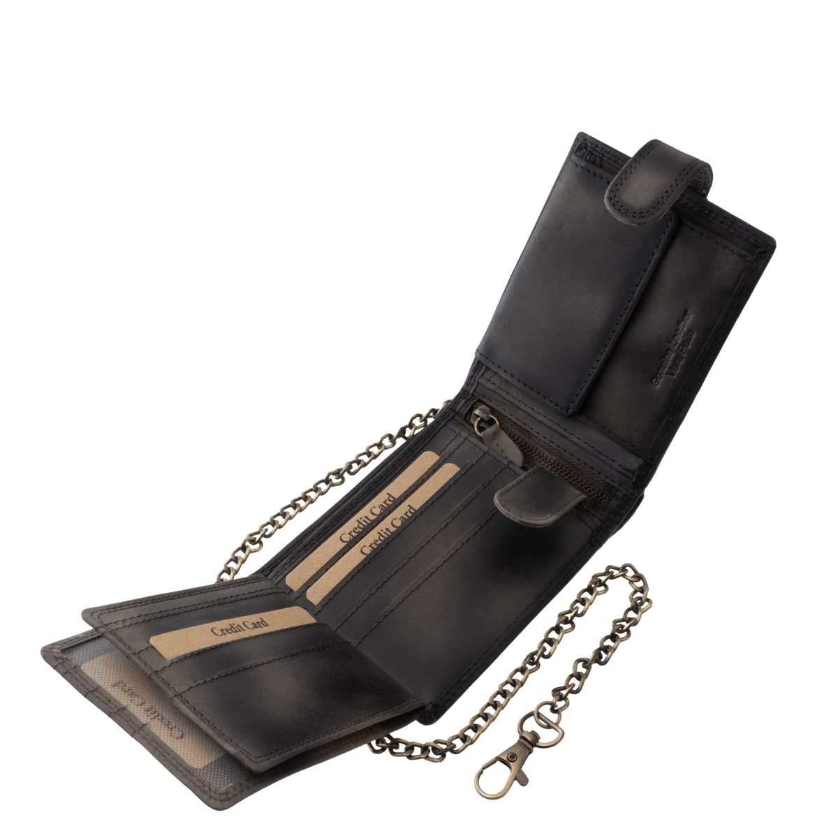 A modell különlegessége az antikolt hatású bőr, valamint a stílushoz tökéletesen illeszkedő, erős karabineres lánc, amely nemcsak látványos kiegészítő, hanem a biztonságosabb pénztárcaviselést is szolgálja.