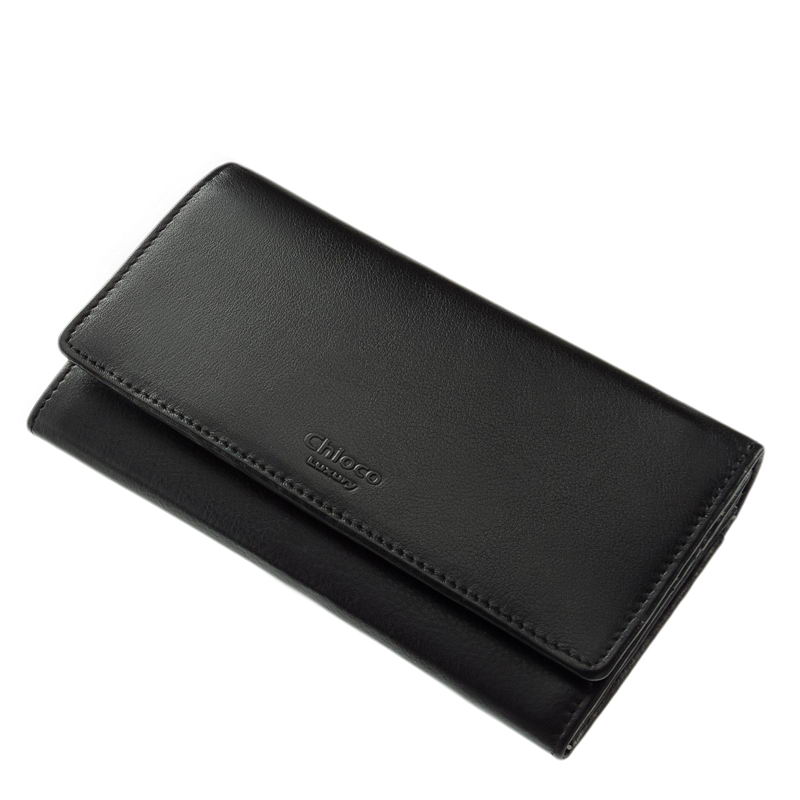 Igényes dísztűzés és a finoman elegáns Chioco Luxury márkanév dekorálja, a pénztárca külsejét.