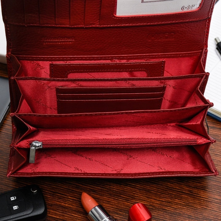 A tárca egyes funkcióit úgy alakítottuk ki, hogy a nőies forma megmaradjon ennél a piros színű mintás női pénztárca modellnél és emellett praktikus, biztonságos használatot nyújtson.