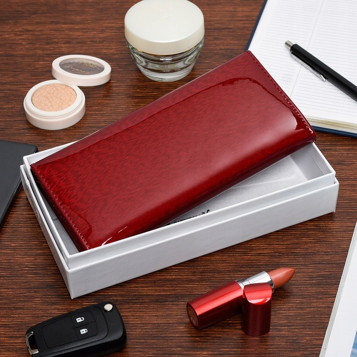 A divatos lakk bőr női pénztárca színe meggy piros, csillogó fényes felülettel.