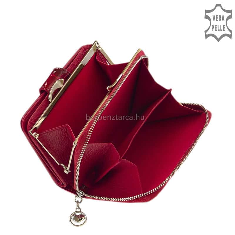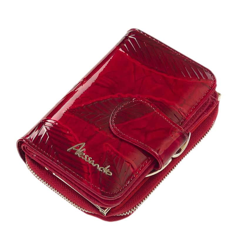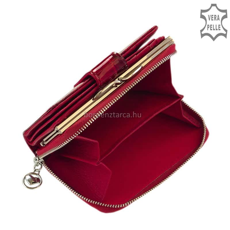 Közepes, praktikus méretű divatos női pénztárca különleges hatású, igazán dekoratív piros lakkbőrből, melyet levél mintás külsővel terveztek.
