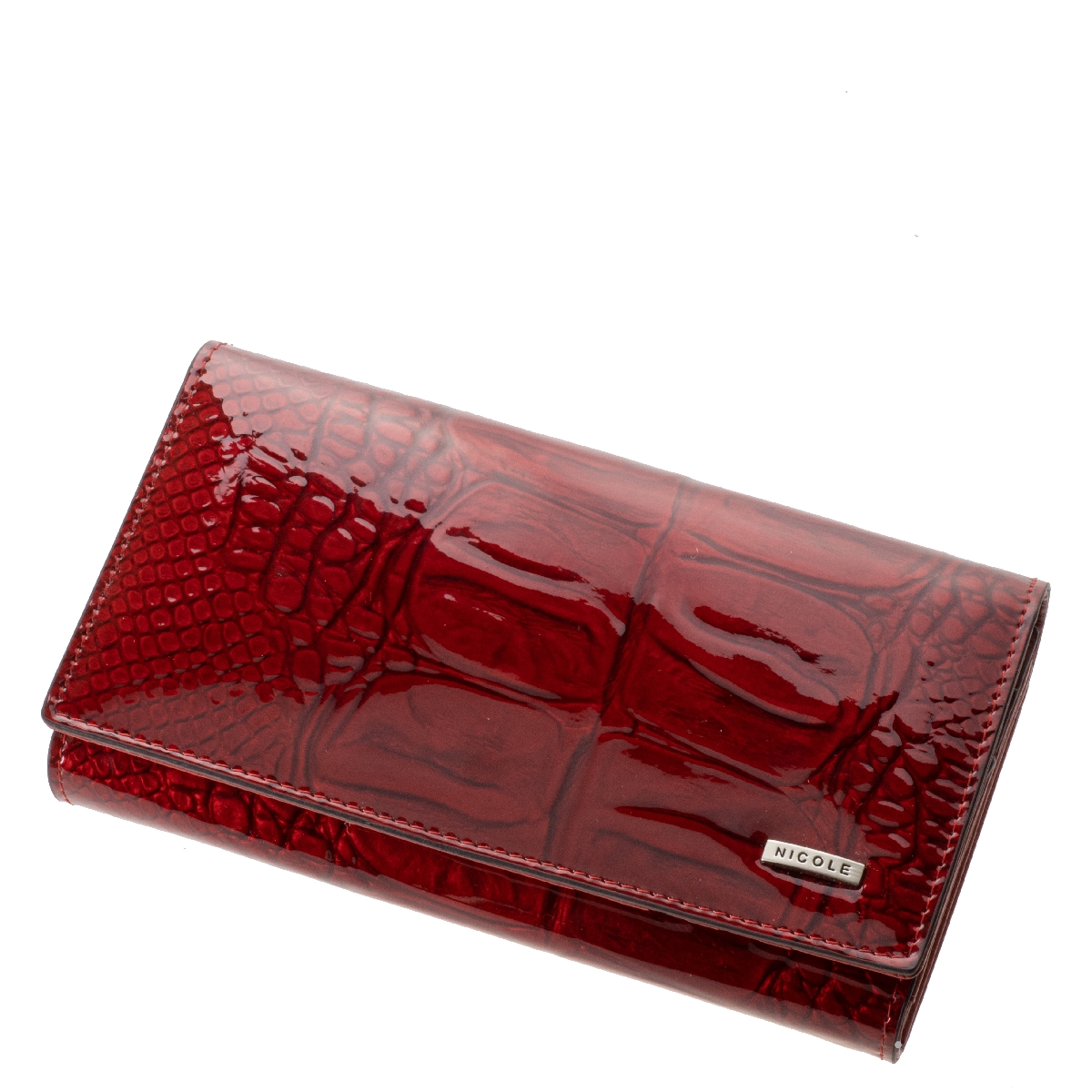 Prémium minőségű, dekoratív lakkozott bőrből készült piros női divat pénztárca, melynek mintázatát a krokodil bőr ihlette.